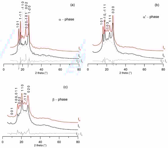 Comparison between observed (red), calculated (black), and Io-Ic difference (grey) powder-diffraction patterns: (a) α-PEF; (b) α’-PEF; (c) β-PEF. Dashed line (grey) represents the sum of background and amorphous phase contributions. The Miller indices of the reflections that mainly contribute to the peak intensities are reported.