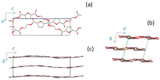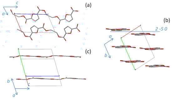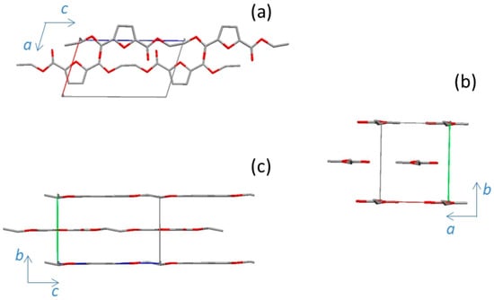 Views of the chain arrangement for the α’-PEF structure: (a) projection down the b-axis; (b) along the c-axis; (c) projection down the a-axis. Oxygen atoms are in red.