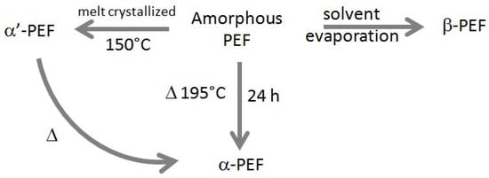 The PEF sample displays an intrinsic viscosity value 0.45 dL/g. Its weight- and number-average molecular weight (Mw, Mn), measured by gel permeation chromatography (GPC) apparatus equipped with differential refractometer as detector (Waters Inc., Milford, MA, USA), are respectively Mw = 24,640 g/mol and Mn = 11,200 g/mol (Polydispersity Index, PDI = 2.2). To attain a high degree of crystallinity and to favor the selective formation of pure crystalline phases, α-PEF was obtained by annealing an “as-synthesized” sample at 195 °C for 24 h, α’-PEF was obtained by isothermal crystallization at 150 °C of a melt-quenched sample, and β-PEF was obtained by slow solvent evaporation at room temperature after dissolution in a trifluoroacetic acid/chlorofom 1/5 v/v mixture and precipitation in cold methanol. An overall sample preparation procedure is reported in Scheme 1.