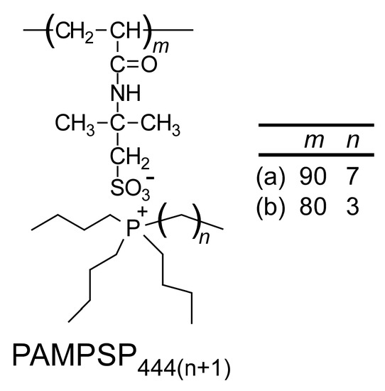 2-Acrylamido-2-methylpropanesulfonic acid (AMPS, 98%, Tokyo Chemical Industry, Tokyo, Japan), 4,4′-azobis(4-cyanovaleric acid) (V-501, 98%, Wako Pure Chemical, Osaka, Japan), tetrabutylphosphonium bromide (P4444Br, 95%, Wako Pure Chemical), and tributyl-n-octylphosphonium bromide (P4448Br, 98%, Tokyo Chemical Industry) were used as received. 4-Cyanopentanoic acid dithiobenzoate (CPD) was synthesized as previously reported []. Pyrene (97%, Wako Pure Chemical) was purified by recrystallization from ethanol. Methanol was dried with 3A molecular sieves and purified by distillation. Water was purified with an ion exchange column system. Other reagents were used as received.