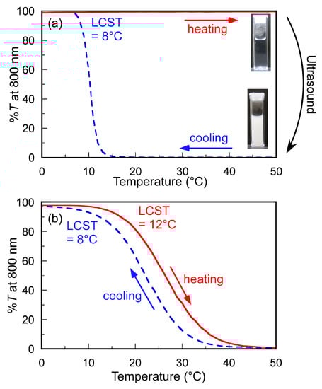 Percent transmittance (%T) at 800 nm for PAMPSP4448 in (a) pure water and (b) 0.1 M aqueous NaCl as a function of temperature at Cp = 5 g/L. The temperature was increased from 0 to 50 °C (heating; —) and decreased from 50 to 0 °C (cooling, ---) at 1 °C/min with stirring. PAMPSP4448 in pure water was sonicated for 10 min at 50 °C and then cooled.