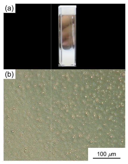 (a) Digital photograph and (b) phase-contrast microscope images of the turbid aqueous PAMPSP4448 solution at Cp = 5 g/L after sonication.