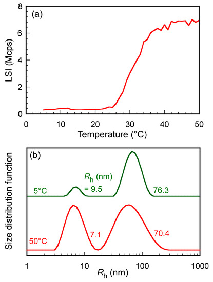 We measured the light scattering intensity (LSI) of the aqueous PAMPSP4448 solution with increasing temperature from 5 to 50 °C (Figure 5a). Although %T was always constant at 100% regardless of temperature, LSI increased at ≥25 °C. The LSI values for the unsonicated transparent aqueous PAMPSP4448 solution at 5 and 50 °C were 0.33 and 7.22 Mcps, respectively. This indicated that dehydration of PAMPSP4448 may proceed at ≥25 °C. When the solution was sonicated for 10 min at 13 °C, it did not become turbid. Phase separation occurred when the aqueous solution was sonicated above 25 °C, where the LSI started to increase. The hydrodynamic radius (Rh) distributions for the aqueous PAMPSP4448 solutions were measured at 5 and 50 °C, because the temperature dependence on the LSI suggested that the association state changed at temperature above 25 °C (Figure 5b). A bimodal Rh distribution with unimers (Rh = 9.5 nm) and aggregates (Rh = 76.3 nm) was observed at 5 °C. The PAMPSP4448 polymer chains were associated with the formation of interpolymer aggregates due to the hydrophobic interactions of the alkyl chains in the counter cation, P4448. At 50 °C, a bimodal Rh distribution was also observed with unimers (Rh = 7.1 nm) and aggregates (Rh = 70.4 nm). The aggregate size (Rh = 70.4 nm) at 50 °C was smaller than that at 5 °C (Rh = 76.3 nm). As the temperature increased, the polymer chain was dehydrated due to cleavage of the hydrogen bonds between water molecules and the pendant amide or sulfonate groups caused by an increase in molecular motion. Dehydration may proceed preferentially inside the interpolymer aggregates with increasing temperature. The aggregate size decreased at 50 °C due to strong hydrophobic interactions inside the aggregates. As the temperature increased, the Rh values of PAMPSP4448 decreased, while the LSI increased. In general, the LSI depends on the particle number, size, and density in solutions [,]. The LSI increased because of the increase in the density of the dehydrated interpolymer aggregates that occurred as temperature increased.