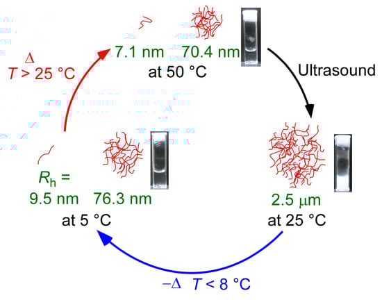 The collision frequency of polymer chains and interpolymer aggregates increased when the somewhat dehydrated polymers were sonicated above 25 °C. When the interpolymer aggregates collide, fusion may occur due to hydrophobic interactions, increasing the size to 2.5 µm. Consequently, the aqueous solution became turbid upon sonication at ≥25 °C. When the turbid solution was cooled below 8 °C, the hydrogen bonds between water molecules and the pendant amide or sulfonate groups in PAMPSP4448 reformed. Thus, the polymer chains were hydrated. Consequently, the large aggregates with a radius of 2.5 µm dissociated into unimers and small aggregates with Rh = 76.3 nm, so that the aqueous polymer solution became transparent. The solution could be repeatedly controlled between turbidity and transparency by sonication and cooling, respectively.