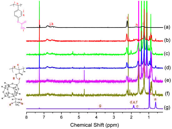 1H NMR spectra, recorded at room temperature, of (a) pure PAS, (b) PAS90-co-PMAPOSS10, (c) PAS80-co-PMAPOSS20, (d) PAS70-co-PMAPOSS30, (e) PAS60-co-PMAPOSS40, (f) PAS50-co-PMAPOSS50, and (g) pure PMAPOSS.