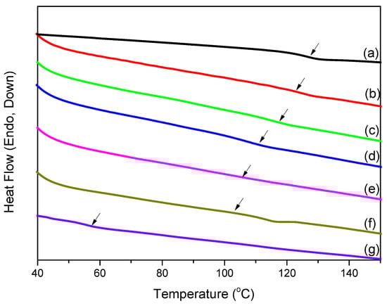 Figure 4 presents DSC thermograms of the pure PAS, pure PMAPOSS, and various PAS-co-PMAPOSS random copolymers, measured at temperatures ranging from 40 to 150 °C. The pure PAS and pure PMAPOSS provided values of Tg of approximately 127 and 56 °C, respectively; each PAS-co-PMAPOSS random copolymer also exhibited a single value of Tg, in the range from 105 to 122 °C [], suggesting that no macrophase separation occurred in these random copolymers.