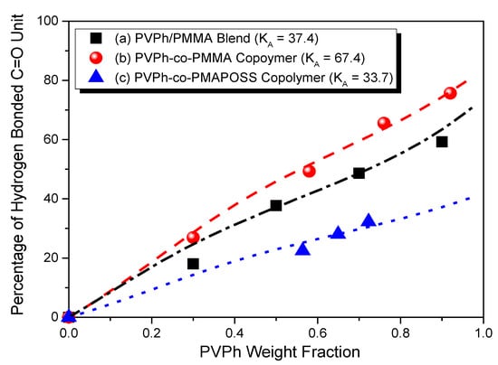 Percentages of hydrogen-bonded C=O units in (a) PVPh/PMMA blends, (b) PVPh-co-PMMA random copolymers, and (c) PVPh-co-PMAPOSS random copolymers, and those predicted using the Painter–Coleman association model to calculate values of KA.