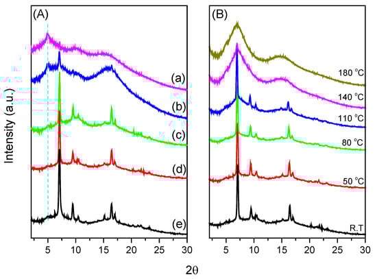 XRD patterns of (A) various PVPh-co-PMAPOSS random copolymers (a) PVPh90-co-PMAPOSS10, (b) PVPh80-co-PMAPOSS20, (c) PVPh70-co-PMAPOSS30, (d) PVPh60-co-PMAPOSS40, and (e) PVPh50-co-PMAPOSS50 and (B) the PVPh60-co-PMAPOSS40 random copolymer recorded at various temperatures.