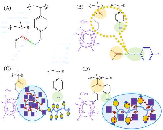 Hydrogen bonding interactions in polymeric materials has garnered much interest over the past three decades for their ability to enhance thermal properties, improve miscibility behavior, induce self-assembly structures, and form nanocomposites [,,,,,,]. The most widely investigated hydrogen-bonded polymer blend system is that of polyvinylphenol/poly(methyl methacrylate) (PVPh/PMMA), in which the OH units of PVPh interact with the C=O units of PMMA (Scheme 1A) [,,,,,,]. Coleman et al. determined the miscibility behavior and inter-association equilibrium constant (KA = 37.4) of such PVPh/PMMA blends []. They also proposed the concepts of functional group accessibility and intramolecular screening effects (γ) based on comparisons with the interactions of PVPh and ethyl isobutyrate (EIB) in solution and of analogous PVPh-co-PMMA random copolymers [,,,]. The intramolecular screening effect has been defined as the self-bending of a polymer chain as a result of same-chain contact, through long-range, but also local, connectivity effects. Furthermore, this group observed a high screening effect when PVPh was blended with a dendrimer-like polyester (γ = 0.8) [], but a low effect with a linear PVPh/PMMA blend (γ = 0.3) [,,,,].