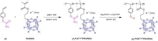 Synthesis of (a) poly(acetoxystyrene-co-methacryisobutyl POSS) (PAS-co-PMAPOSS) and (b) PVPh-co-PMAPOSS random copolymers.