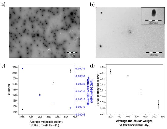 | Average molecular weight(Mn) of PEGDMA (g/mol) | Size (nm) | Polydispersity index (PDI) |