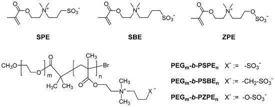 The 3-((2-methacryloyloxyethyl)dimethylammonio)propane-1-sulfonate) SPE (Sigma-Aldrich) was used as received. The 4-((2-methacryloyloxyethyl)dimethylammonio)butane-1-sulfonate) SBE was kindly provided by Viet. Hildebrand; its synthesis is described in reference [76]. The 3-((2-methacryloyloxyethyl)dimethylammonio)propane-1-sulfate) ZPE was synthesized by adapting a previously reported procedure [80]. By modifying the recipe, the yield could be improved. Also, the amounts of highly toxic alkylating agent propylenesulfate remaining in the reaction mixture were strongly minimized thus facilitating the work up. In detail, 2-(dimethylamino)ethyl methacrylate (61.9 g, 394 mmol, 1.1 eq) in dry acetonitrile (50 mL) was added to a stirred solution of 1,3,2-dioxathiane 2,2-dioxide (49.5 g, 358 mmoL, 1.0 eq.) in dry acetonitrile (400 mL) at ambient temperature. The mixture was stirred at 50 °C for three days. When the mixture was cooled to ambient temperature, the monomer began to precipitate. Acetone was added to complete its precipitation. The solid was filtered off, washed with acetone, and dried in vacuo. Monomer ZPE was obtained as a colorless solid (102.8 g, 97%).
