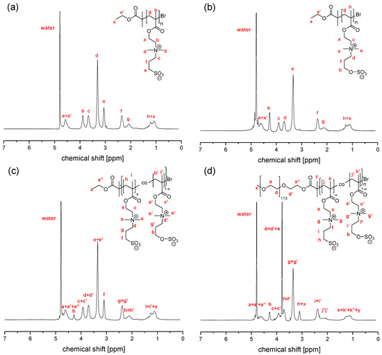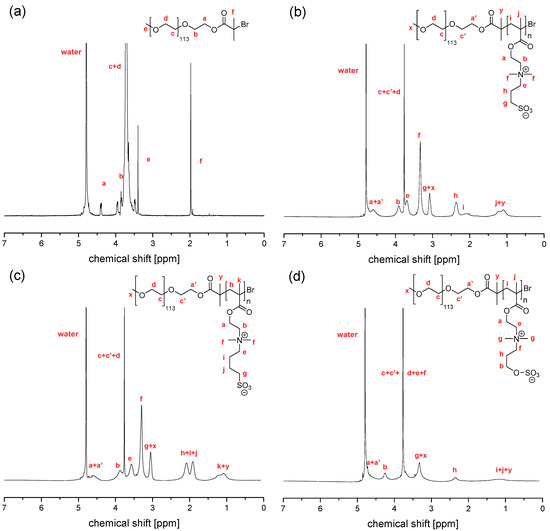 The nonionic-zwitterionic block copolymers were prepared by ARGET ATRP polymerization of zwitterionic methacrylates (Figure S1), and characterized by standard methods such as 1H NMR and SEC. The integration of the 1H NMR signals of macroinitiator mPEG-Br (see Figure 2a) corroborates its number average molar mass Mn of 5.2 kg·mol−1 (DPn = 114; using the integral ratios of signals “a”–”d” vs. “e”), as well as the quantitative esterification (using the integral ratios of signals “e” vs. “a” or “f”). The successful extension of the PEG block to create the zwitterionic copolymers PEG114-b-PSPEn, PEG114-b-PSBEn, and PEG114-b-PZPEn (cf. Figure 1) is already qualitatively demonstrated by the 1H NMR spectra, which show the presence of both constitutional repeat units in the product (Figure 2b–d). This is corroborated by the SEC elugrams, which show that the molar mass distributions shifted to longer elution times compared to the macroinitiator employed, without an indication of any remaining unreacted macroinitiator. Polymerization conditions and results are summarized in Table 1.
