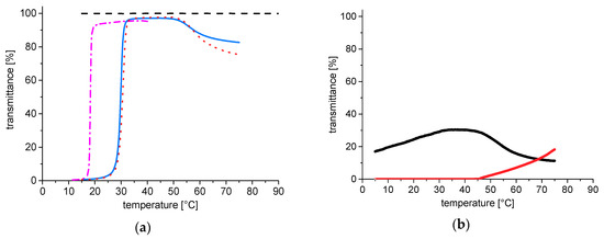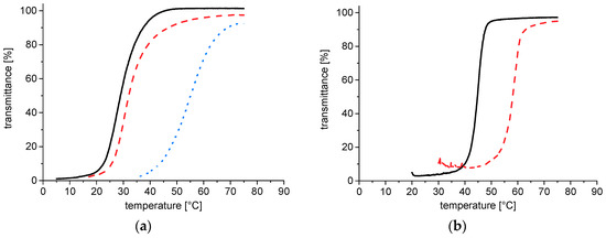 Cloud point measurements used a Varian Cary 50 Scan UV–Vis spectrophotometer (Agilent, Waldbronn, Germany) equipped with a thermoelectric Peltier element for temperature control. In an optical silica cuvette of 1 cm inner path length, the transmission of polymer solutions was monitored at 500 nm as a function of temperature with cooling and heating rates of 1 K·min−1. The cloud points upon cooling, CPUCST, and upon heating, CPLCST, were defined as the temperatures where a sharp decrease of transmittance sets in.