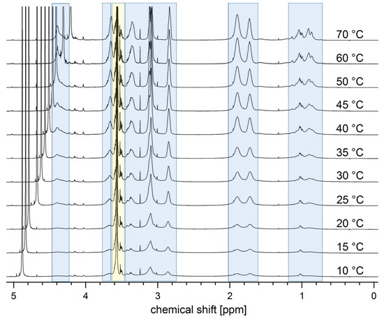 In order to learn more about the complex thermoresponsive behavior of PEG-b-PSBE-1, we followed the evolution of the NMR spectra in water in function of the temperature (Figure 6). Clearly, the signal characteristics of the PSPE block, which are highlighted in blue, are strongly broadened at low temperatures, but gain both intensity and at least moderate resolution upon heating beyond 35 °C. Although markedly attenuated, the PSBE signal characteristics for the 4-ammoniobutylsulfonate moiety (between 1.5 and 3.5 ppm) are still clearly distinguishable at 10 °C. This provides evidence of a substantial remaining hydration of the polyzwitterion well below CPUCST. The somewhat elevated transition temperature CPUCST in heavy water (D2O) compared to light water (H2O) (cf. Table 3) is characteristic of the thermoresponsive behavior of many poly(sulfobetaine)s, including PSBE, but is not yet understood [75,76].