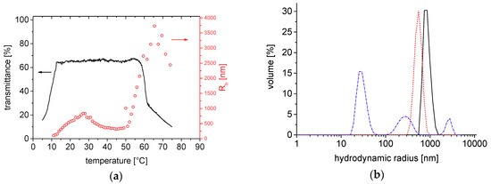 Temperature dependent study (cooling run) of 3.0 g·L−1 solutions in NSS of ZPE-based block polymer PEG-b-PZPE-1: (a) by turbidimetry (cooling run); values for the apparent average hydrodynamic radius Rh are also shown (O); (b) distributions of the hydrodynamic radii at 11 °C (-·-·-·-), 35 °C (- - - - -), and 75 °C (—).
