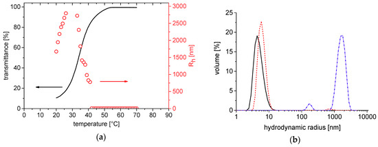 Temperature dependent study of 3.0 g·L−1 solutions of statistical block copolymer PEG-b-P(SPE-co-ZPE)-2 in NSS: (a) by turbidimetry (cooling run); values for the apparent average hydrodynamic radius Rh are also shown. (O); (b) distributions of the hydrodynamic radii at 20 °C (-·-·-·-), 41 °C (- - - - -), and 70 °C (—).