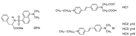 In these orienting studies, we screened the solubilization of a set of anionic (DPA, HC1) and cationic (HC2, HC3, HC4) solvatochromic fluorescent dyes (Figure 9), that are known to be solubilized by classic low- and high-molar-mass micellar systems, and which show a marked change of their emission properties (such as quantum yield or emission wavelengths) when present in an organic or an aqueous environment.