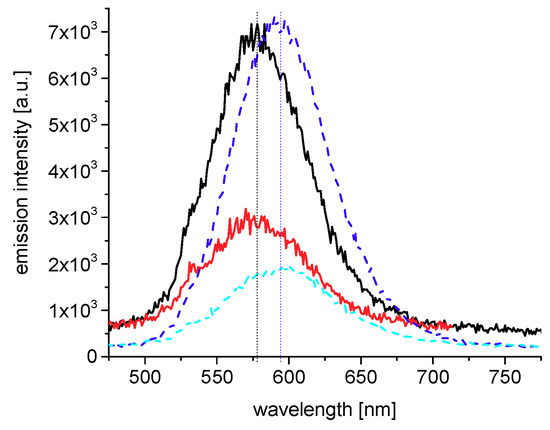 The situation was different for the anionic/ampholytic fluorophore HC1 in NSS. Here, the emission maximum of the dye in the presence of PEG-b-P(SPE-co-ZPE)-2 was significantly blue-shifted to 578 nm compared to the control sample of HC1 in NSS without the copolymer present, where the emission maximum was at 594 nm (Figure 10). In a simplistic interpretation, the blue-shift should be indicative of an increased polarity felt by the dye in the presence of the zwitterionic copolymer. However, such a direct correlation of the wavelength of the emission maximum and the polarity of the fluorophore’s environment was shown to be only valid within the series of linear alcohol homologues [83]. Notwithstanding the presently unclear structural implications of the blue shift observed, the shift indicates an interaction of the dye with the polymer. Yet, although the spectra differ markedly in the presence and absence of the copolymer, they do not exhibit a meaningful evolution with increasing temperature for a given solution, i.e., with or without the copolymer. We only observed the expected moderate decrease of emission intensity, which is not conclusive with respect to a polarity change of the dye’s environment. However, no spectral shift was noted upon heating above CPUCST. This finding could imply two scenarios, either the dye is bound by the polysulfobetaine block independent of its solution state, or the dye binds to the PEG block, which is not thermoresponsive in NSS. Whatever the explanation, hemicyanine HC1 does not experience the aspired UCST-transition-triggered controlled uptake and release scenario, which might have been expected in the presence of thermoresponsive PEG-b-P(SPE-co-ZPE)-2.