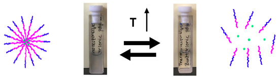 Amphiphilic block copolymers are generally considered to behave as “macrosurfactants” [1,2,3,4,5]. Despite their structural similarity to standard surfactants, they feature a distinct property profile with characteristic differences to their low molar mass counterparts. In particular, their self-assembly into micelles—or other aggregates, such as vesicles—is non-ergodic when the hydrophobic block exceeds a quite small critical size [6,7,8,9,10]: in this case, amphiphilic block copolymers require special preparation procedures for their self-assembly. Typically, the block copolymer is dissolved in a non-selective organic solvent that is water-miscible, the polymer solution is mixed with an excess of water, and finally, the solvent is removed, e.g., by evaporation or by dialysis [1,4,6,11,12]. To circumvent such a cumbersome procedure, “smart” macrosurfactants may be used, in which the hydrophobic block is designed to be stimulus-responsive and can reversibly change its character from hydrophilic to hydrophobic upon exposure to a trigger [8,13,14,15]. In this way, the amphiphilic character, and thus the self-assembly of the block copolymers, can be deliberately switched “on” and “off”. Furthermore, such a responsive aggregation behavior enables control of the system’s viscosity [16,17,18,19], as well as the transport and controlled delivery of poorly water-soluble active agents [20,21,22] (Scheme 1).