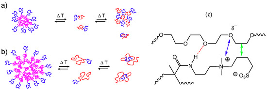 Hypothetical two-step, thermo-responsive self-assembly of block copolymers PEG-b-SBE. (a) if the zwitterionic and the nonionic blocks are of similar size, (b) if the zwitterionic block is much larger than the nonionic one, (c) possible interactions between the zwitterionic and the nonionic blocks: hydrogen bonding (----), electrostatic interactions (monopole—dipole ←→), hydrophobic (←→) interactions. In (a,b), lines signify: — = nonionic block, — = zwitterionic block below UCST-transition, — = zwitterionic block above UCST-transition.