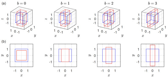 Prominent, qualitatively different examples for isochoric deformations (red) of a unit cell (blue) in shearfree flows: (i) uniaxial extension (), (ii) planar extension (), (iii) elliptical extension (), and (iv) equibiaxial extension (). For each scenario the situation is depicted both in (a) 3D and (b) projected to the x–y–plane. Coordinates are related via by the deformation gradient tensor , c.f. Equation (3), here shown for .
