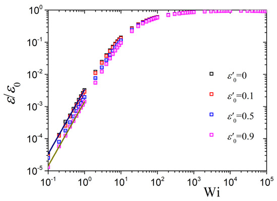 In Figure 4b we show the same variation as in Figure 4a but now with . Again, follows Equation (24), or Equation (25) for the case of , at small elongation rates and, irrespective of the value of , reaches monotonically the same value at large elongation rates. This value is simply equal to