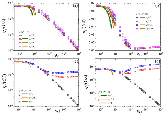 Figure 4a shows the variation of upon changing (or ) while keeping and fixed. The prediction at small elongation rates is independent of the value of and approaches the value . However, as increases the first planar viscosity shear-thins after about . This is in disaccord with the predictions for the uniaxial elongation viscosity of the tumbling-snake model, , which seems to be passing from a maximum when (see inset of Figure 2a of Ref. [39]). However, both share the same power-law behavior at large elongation rates which is always equal to −1 irrespective of the value of , as for the Doi & Edwards model [18].