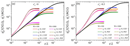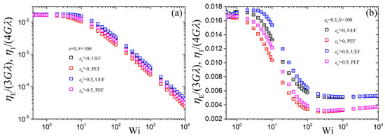Comparison of the predictions for the first planar (black, blue, denoted as PEF in the legends) and uniaxial (red, pink, UEF) reduced viscosities as a function of dimensionless elongation rate for and two values of the parameter . (a) , (b) .