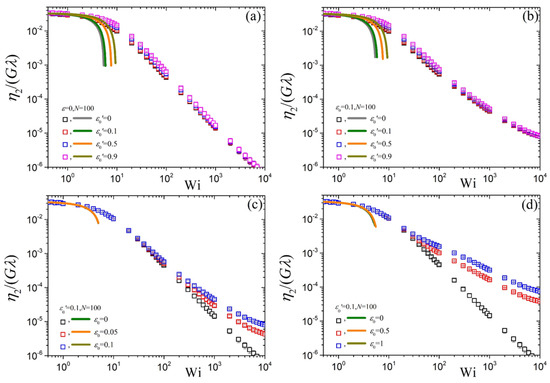 The reduced steady-state second viscosity, , as a function of the dimensionless elongation rate is presented in Figure 6. As for , the prediction at small elongation rates is independent of the values of and in accord with Equation (24), or Equation (25) for the case of , and approaches the value . Also, like , as increases the second viscosity shear-thins after about . It can be noted that the predictions when is kept fixed (panels a and b) are almost the same irrespective of the value of and the power-law behavior at large elongation rates when is equal to as for the Doi & Edwards model. In panels Figure 6c,d we note that as the increases under fixed , increases after about .