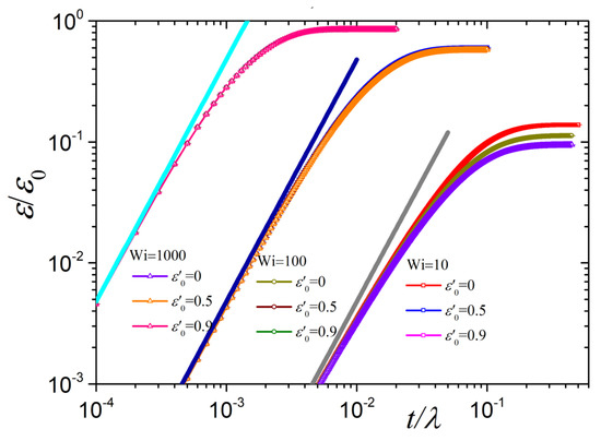 Next we inspect the transient link tension coefficient, , as a function of dimensionless time for and various values of the parameter and dimensionless elongation rates (Figure 7). At early times, this coefficient follows according to Equation (19) with , irrespective of and , whereas at larger times it monotonically approaches the steady-state values of the squared order parameter . A similar behavior was also noted for the transient behavior of the variable link tension coefficient in uniaxial elongation [39].