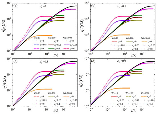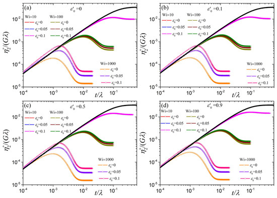Predictions for , analogously to Figure 7 for , for the model with variable as a function of time for and various values of the parameter and the dimensionless elongation rate for (a) , (b) , (c) , and (d) . The solid black lines represent the linear viscoelastic results, Equation (28). For the model with constant the transient viscosities do not vanish in the limit (see Supplementary Section B).