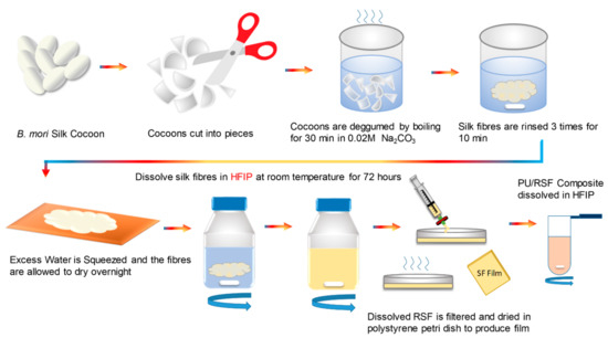 Several studies reported the procedure for extraction of regenerated silk fibroin [32,33,34,35,36]. As shown in Figure 2, B. mori silk cocoons (purchased from Regent Science Industry Limited, Shenzhen, China) were cut into pieces and boiled in 0.02 M Na2CO3 (Sigma Aldrich, Saint Louis, USA) aqueous solution for 30 min. After boiling, silk was rinsed using ultrapure water for 10 min and repeated 3 times to remove residual sericin. After rinsing, excess water was squeezed out from the degummed silk and the fibre was spread in aluminium foil and allowed to dry overnight under a fume hood. Later, the dried fibres were dissolved in HFIP at room temperature for 72 h under continuous stirring. After dissolving, RSF was filtered using a PTFE syringe filter with pore size of 0.45 µm and 25 mm diameter to remove any undissolved and suspended particles. Following filtration, RSF was casted into films by pouring concentrated solution in polystyrene petri dish and leaving it for drying at room temperature.