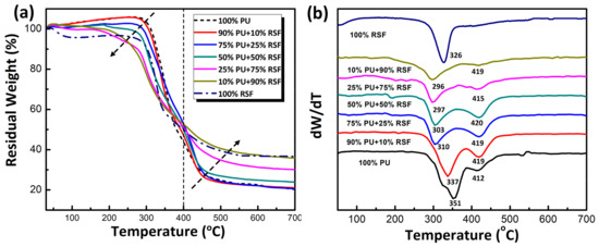 (a) Thermogravimetric Analysis (TGA) of PU/RSF blended fibres with different blend ratios; and (b) differential thermogravimetric (DTG) curves of PU/RSF blended fibres with different blend ratios.