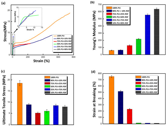 Tensile properties of PU/RSF blended fibres: (a) Stress–strain curves of PU/RSF composite fibres. The blend composition of 75/25 exhibits FTSS properties. The stress–strain curves with significantly less strain values are displayed in insets. (b) Young’s modulus of PU/RSF composite fibres. The increase in RSF component improved young modulus of fibres significantly (c) Ultimate tensile stress of PU/RSF composite fibres. The 100% PU represents highest tensile stress values than PU/RSF blended fibres. (d) Strain at breaking (%) of PU/RSF fibres. The increase of crystalline domains in amorphous PU matrix has reduced the strain at break of fibres significantly.