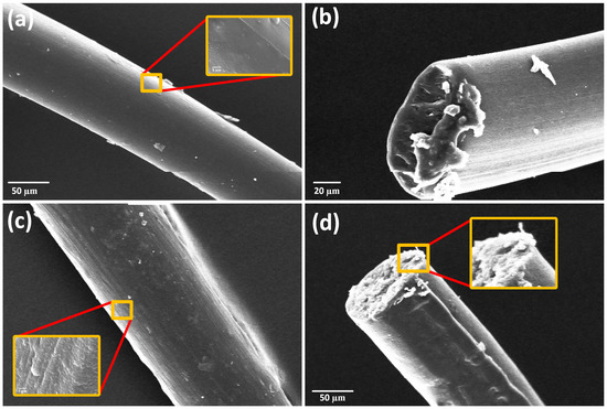 SEM images of PU and PU/RSF composite fibres: (a) longitudinal view of PU fibres; (b) fractured section of PU fibres; (c) longitudinal view PU/RSF (75/25) composite fibres; and (d) fractured section view PU/RSF (75/25) composite fibres.