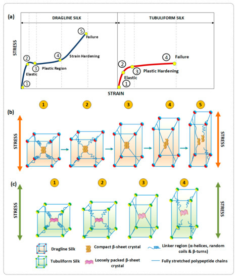 (a) Schematic for different stages of deformation in dragline silk and tubuliform silk (Reproduced with permission from [7], 2006 Sage Publications); (b) deformation model of dragline silks; and (c) deformation model of tubuliform silks.