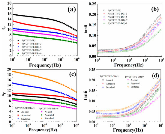 - Li, J.J.; Gong, H.H.; Yang, Q.; Xie, Y.C.; Yang, L.J.; Zhang, Z.C. Linear-like dielectric behavior and low energy loss achieved in poly(ethyl methacrylate) modified poly(vinylidene fluoride-co-trifluoroethylene). Appl. Phys. Lett. 2014, 104, 263901. [Google Scholar] [CrossRef]
