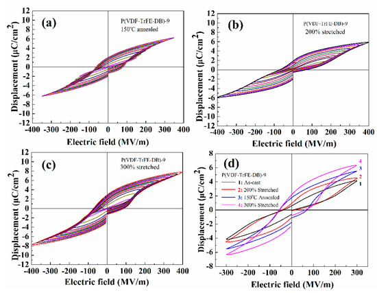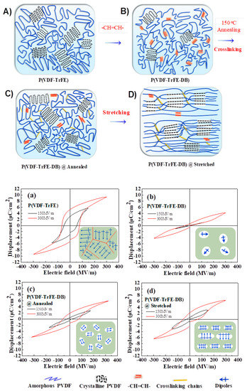 - Tan, S.B.; Hu, X.; Ding, S.J.; Zhang, Z.C.; Li, H.Y. Significantly improving dielectric and energy storage properties via uniaxially stretching crosslinked P(VDF-co-TrFE) films. J. Mater. Chem. A 2013, 1, 10353–10361. [Google Scholar] [CrossRef]