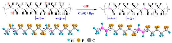 - Zhang, Y.N.; Zhao, Y.F.; Tan, S.B.; Zhang, Z.C. Inserting –CH=CH– into P(VDF-TrFE) by C–F activation mediated with Cu(0) in a controlled atom transfer radical elimination process. Polym. Chem. 2017, 8, 1840–1849. [Google Scholar] [CrossRef]