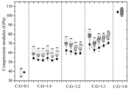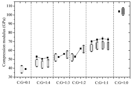 The compression modulus of intralayer hybrid composites with various mixing ratios and hybrid structures are presented in Figure 8. It was found that the modulus of intralayer hybrid composites increases progressively as the carbon fiber content increases. However, the impact of various layer structures on the modulus of a hybrid composite is not significant at the same C/G mixed ratio.