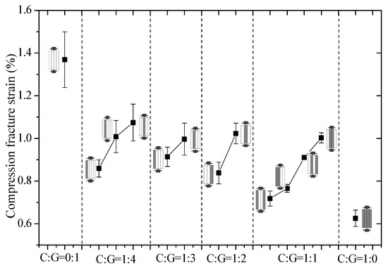 The results, presented in Figure 4, indicate that the compressive fracture strain of interlayer hybrid composites takes on an evident downward trend as carbon fiber content increases. The stacking sequence has a significant influence on the compressive strain at the same mixed ratio. As accordingly found, the compression fracture strain of an interlayer hybrid composite is comparatively large as glass fiber tends to be in the outer layer and carbon fiber in the inner layer, such as [G–C–C–G], [G–C–G], and [G–G–C–G–G]. Besides, compression fracture strain is small while the carbon fiber is all distributed in the outer layers, such as [C–G–G–C], [C–G–G–G–G], [C–G–G–G], and [C–G–G].
