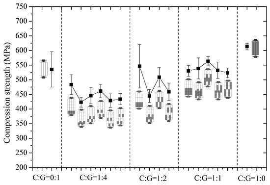 The results on the compression modulus and strength with various mixed ratios and hybrid structures in the 90-degree direction are presented in Figure 7. No evident impact is exerted by mixing ratios and the hybrid structure of C/G hybrid composites on the 90-degree compression modulus and strength. The compression properties of the 90-degree direction are primarily determined by the compression property of the resin given that the fiber is all arranged along the 0-degree direction.