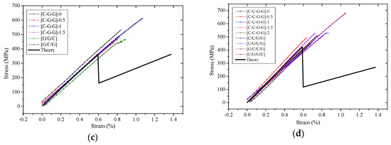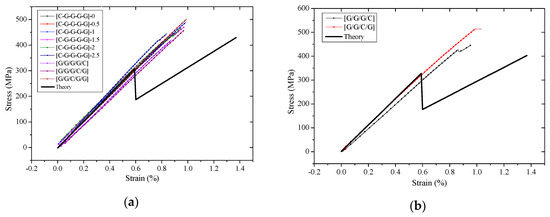 The experimental and theoretical compression strength of hybrid composites is presented in Figure 12. In theory, the compression strength tends to decrease first and then increase as the content of carbon fiber increases. As indicated in the theoretical analysis, the compression strength of a hybrid structure is minimized for the 1:2 C/G mixed ratio. The experimental compression strength of the interlayer and intralayer hybrid composites is above the theoretical values, which demonstrates a positive hybrid effect, and the compression strength takes on an increasing trend as the carbon fiber content increases. The impact exerted by variations in layer structures of an interlayer hybrid on the compression strength is greater than an intralayer hybrid at the same mixed ratio. The compression strength of the interlayer structure, such as [G–C–C–G] and [G–C–G], is deemed to be basically stronger than or equal to pure carbon fiber composites which makes it possible to achieve higher compressive strength with less carbon fiber content.