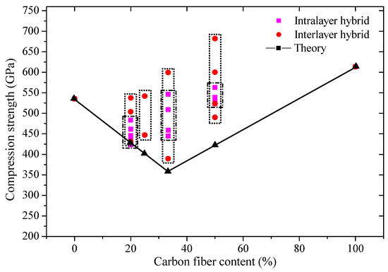 - As indicated through comparing experimental results and theoretical calculation values for interlayer and intralayer hybrid composites, the experimental compressive modulus is consistent with theoretical values calculated via the ROM, while the experimental compressive strength surmounts the theoretical values and exhibits a positive hybrid effect.