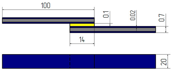 Hot-dip galvanized steel sheet was used to make 20 × 100 × 0.7 mm specimens which were subjected to adhesive bonding. Strength tests were performed on single-lap adhesive joints, the shape and theoretical dimensions of which are shown in Figure 1.