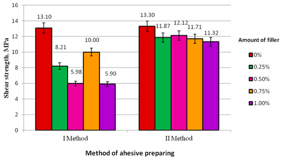 Comparing both methods of adhesive preparation it was noted that in both cases the strength of adhesive joints made using the modified adhesive with varying modifier contents is lower than that yielded in the control experiments (Method I—13.10 MPa; Method II—13.30 MPa). The strength of adhesive joints produced with adhesives prepared according to Method II is much higher than that of adhesives joints produced according to Method I. The highest difference can be observed comparing the control experiment result (13.10 MPa) of the adhesive joints produced according to Method I with the result of the specimens with additive concentration of 1% (5.90 MPa)—here the difference is 65%. It was also observed that Method II yield higher repeatability of strength results than Method I. It can therefore be claimed that the application of Method II enables producing adhesive joints with much more uniform properties.