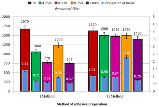 The chart in Figure 3 shows that the maximum force of adhesive joint specimens produced using adhesives with varying concentrations according to Methods I and II are lower than those of the control experiments (Method I—1670 N and Method II—1620 N). The highest difference can be observed in the results of specimens modified by Method I. The standard force for the concentrations 0.50% and 1% is approximately two times smaller than that of the referential specimen. The elongation of the zero specimen (1.41 mm) regarding Method I is higher than that for the applied concentrations, ranging between 0.43 mm and 0.84 mm. With Method II, mean elongation of the specimens with a concentration of 0.75% (2.30 mm) is two times higher than that of the 0% specimens (1.01 mm), and the values of elongation of adhesive joints produced using the modified adhesive with varying concentrations of the modifying agent do not reveal any significant difference compared to the results of specimens in the control experiments. The data comparison (Figure 3) reveals that the highest elongation can be observed for the specimens produced by Method II for a concentration of 0.75% (2.30 mm).
