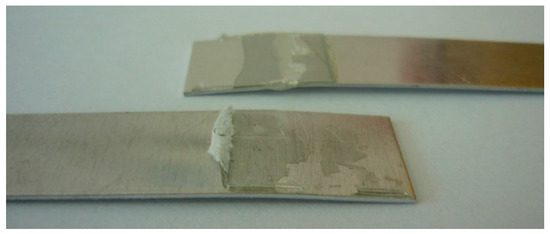 Following the curing and seasoning process (Table 4), the strength tests were performed to determine hot-dip galvanized steel sheet adhesive joints shear strength. The experimental tests in which the single-lap adhesive joints undergo failure were performed using the Zwick/Roell Z150 testing machine in compliance with DIN EN 1465 [51] and at a speed of 5 mm/min. The specimens of made joints were fixed in the screw-wedge clamps of the testing machine. The strength tests were performed for 8 to 12 adhesive joints in 3 test runs per each variant of adhesive joints preparation (epoxy adhesive preparation method and seasoning period) and in 5 test runs taking account of modified and unmodified epoxy adhesives (5 × 10 test runs). The total amount of tested adhesive joints amounted to 150 items. The basic statistics of the results were made. The mean and standard deviation were determined, rejecting the extreme values of the obtained results.