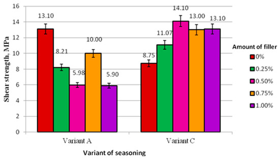 The chart in Figure 5 reveals that the specimens produced by Method I and subjected to seasoning (Variant C) have a higher shear strength compared to control specimens (8.75 MPa). The strength of adhesive joints produced with modified adhesives exceeds the strength of referential specimens as follows for respective concentrations: 0.25–27%; 0.50–61%; 0.75–49%; and 1–50%. These results clearly differ from the results of specimens produced using Method I (Variant A), where the specimens prepared using unmodified (referential) adhesive have the highest strength.